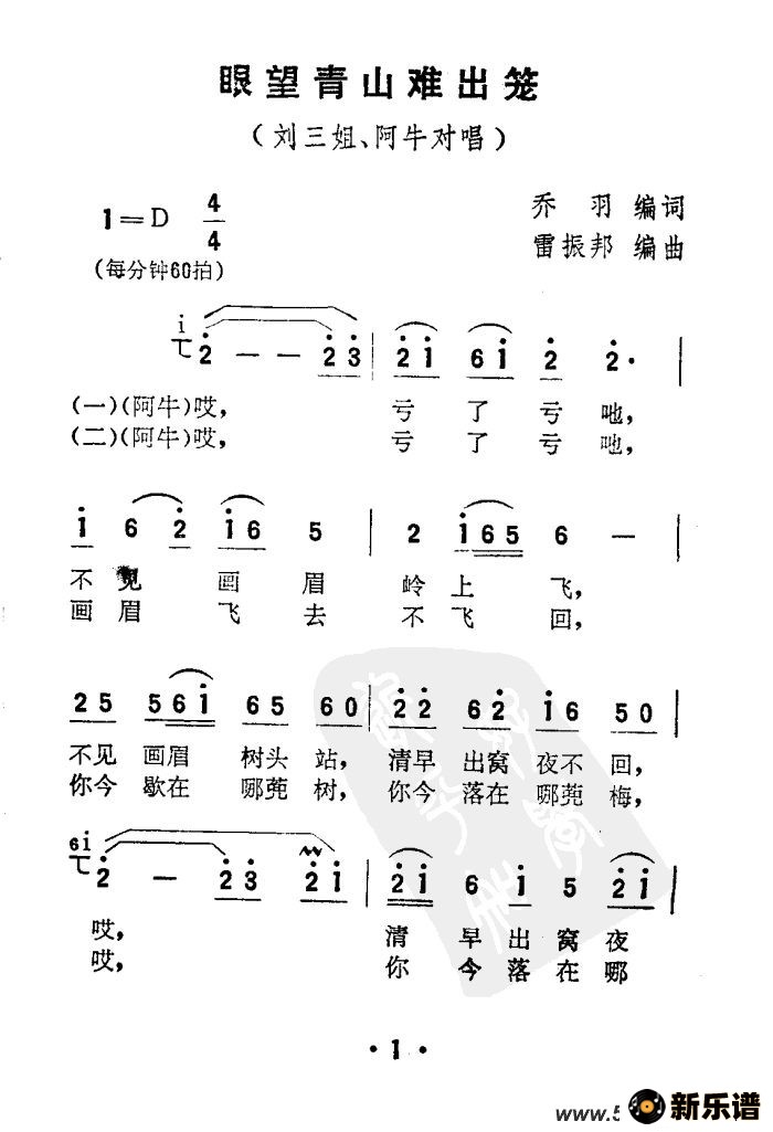 眼望青山难出笼(电影《刘三姐》选曲) 演唱的眼望青山难出笼(电影《刘三姐》选曲)歌词,眼望青山难出笼(电影《刘三姐》选曲)最新曲谱. 版本一版本二:选自乔羽编著《影片 刘三姐 歌曲集》,刘三姐、阿牛对唱。