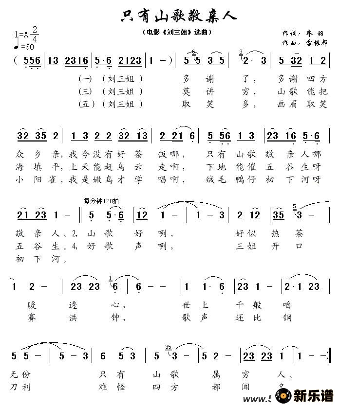 > 只有山歌敬亲人(电影《刘三姐》选曲)最新曲谱