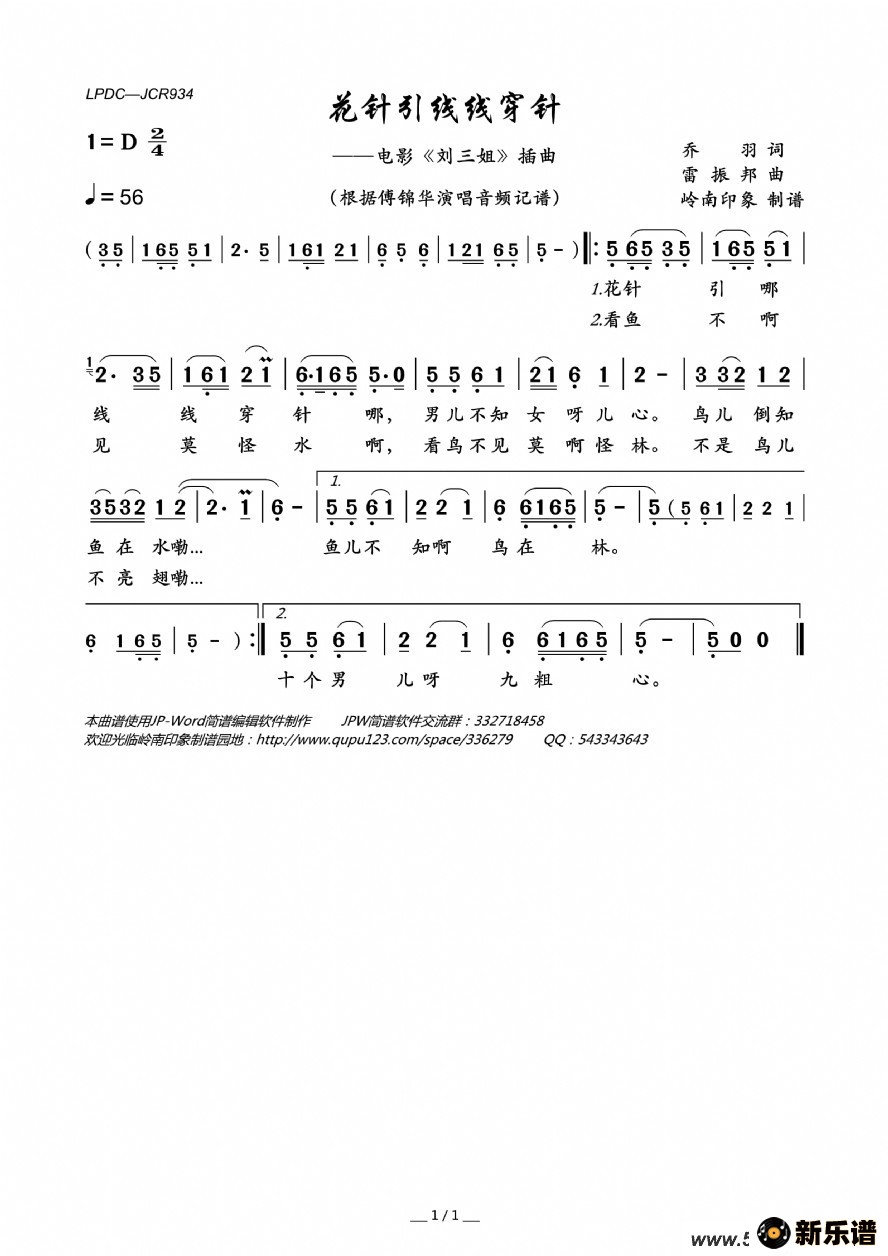 《花针引线线穿针(电影《刘三姐》插曲)》最新曲谱 傅锦华-岭南印象制谱