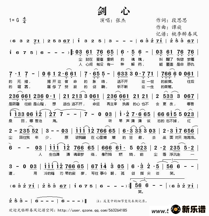 《剑心》最新曲谱 张杰-桃李醉春风制谱