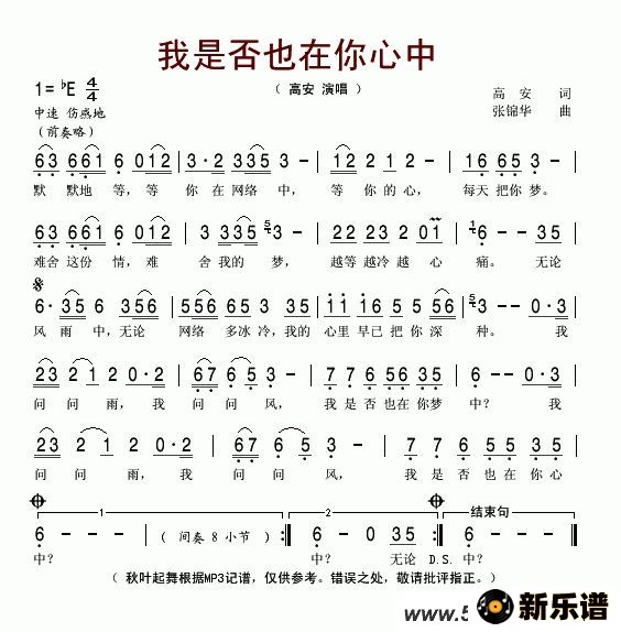> 我是否也在你心中最新曲谱