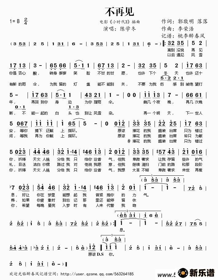 《不再见(电影《小时代3》插曲)》最新曲谱 陈学冬-桃李醉春风制谱