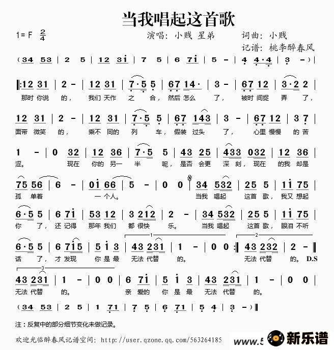 《当我唱起这首歌》最新曲谱 小贱&星弟-桃李醉春风制谱