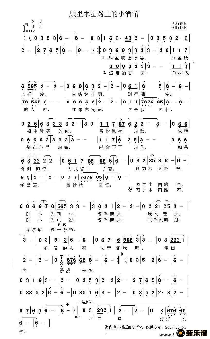 《顾里木图路上的小酒馆》最新曲谱 狼戈