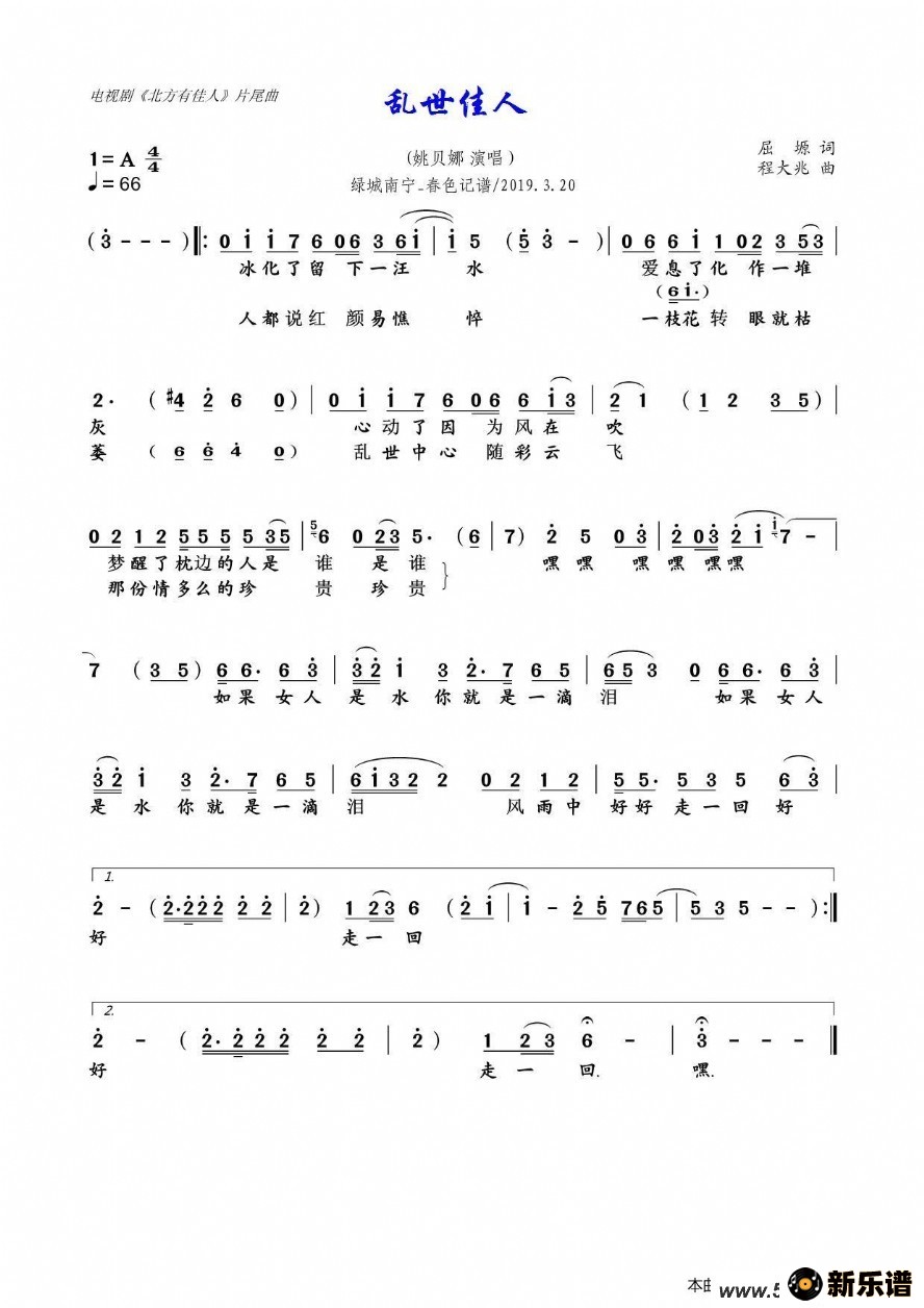 > 乱世佳人(电视剧《北方有佳人》片尾曲)最新曲谱