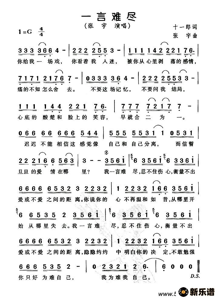 张宇演唱的一言难尽歌词,一言难尽最新曲谱.