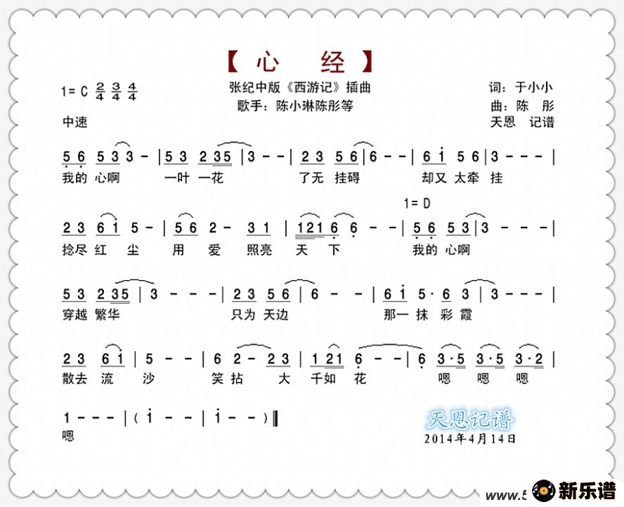 《心经(张纪中版西游记插曲)》最新曲谱 陈小琳 陈彤等-天恩制谱