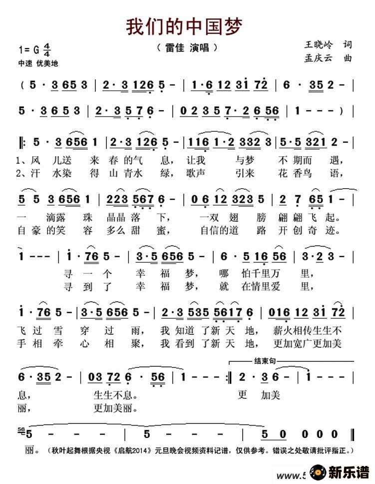 《我们的中国梦》最新曲谱 雷佳-秋叶起舞制谱