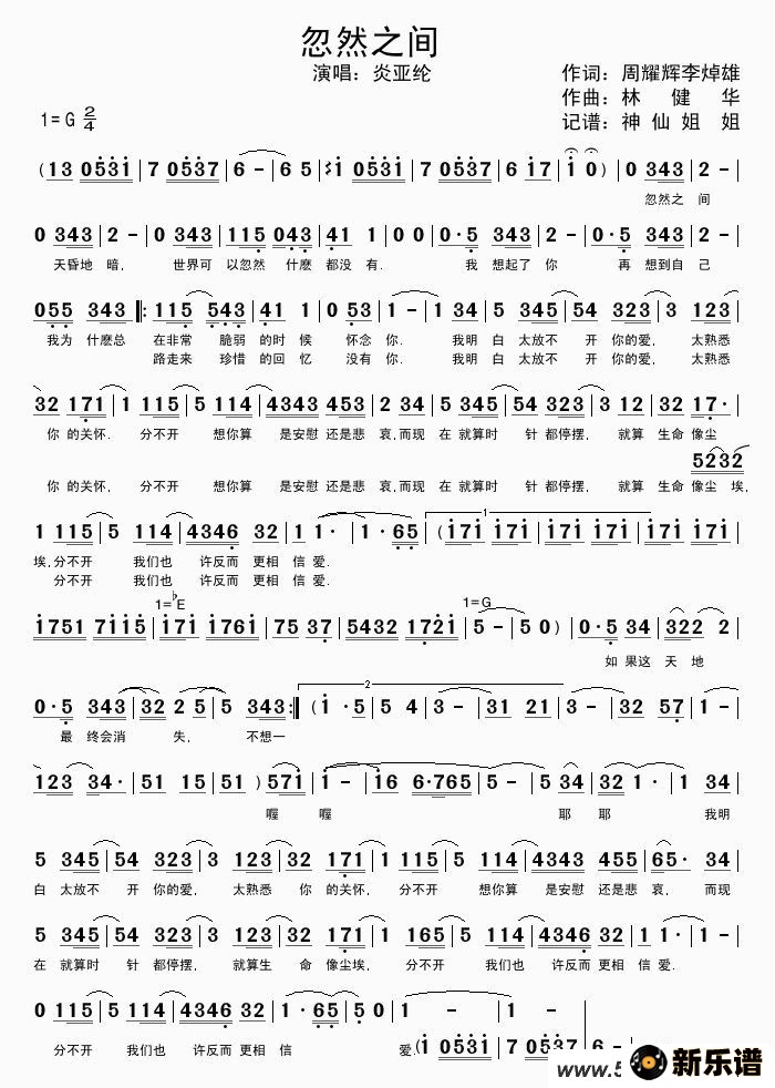 炎亚纶演唱的忽然之间歌词,忽然之间最新曲谱.