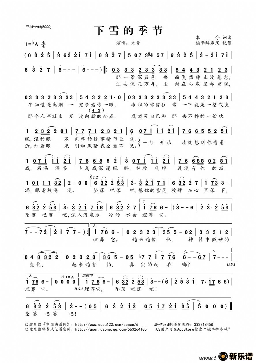 《下雪的季节》最新曲谱 本兮-桃李醉春风制谱