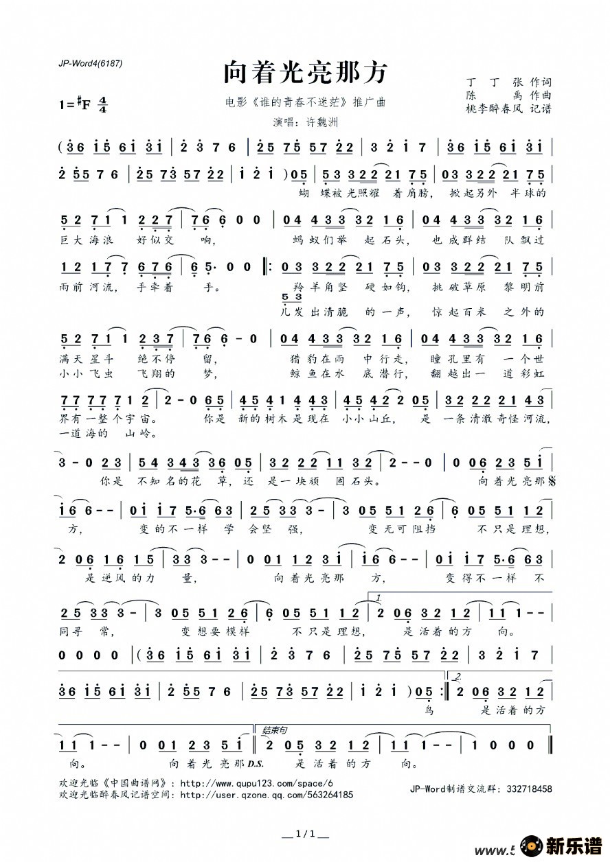 向着光亮那方(电影《谁的青春不迷茫》推广曲)许魏洲 许魏洲演唱的向着光亮那方(电影《谁的青春不迷茫》推广曲)歌词,向着光亮那方(电影《谁的青春不迷茫》推广曲)最新曲谱. 此最新曲谱由新乐谱会员 桃李醉春风 上传
