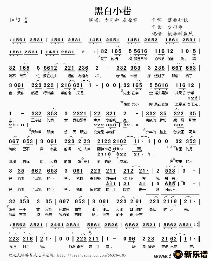 少司命、灰原穷演唱的黑白小巷歌词,黑白小巷最新曲谱.