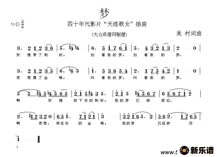 演唱的梦(电影《天涯歌女》插曲)歌词,梦(电影《天涯歌女》插曲)最新曲谱.