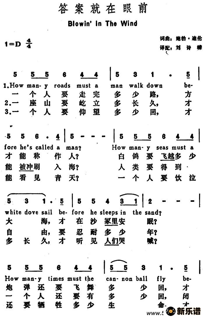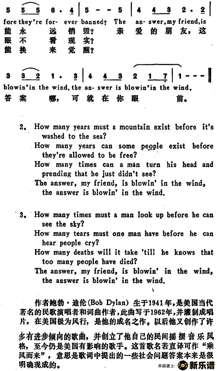 作词:鲍勃·迪伦词 刘诗嵘译配 作曲:鲍勃·迪伦词(Blowin’ In the Wind)