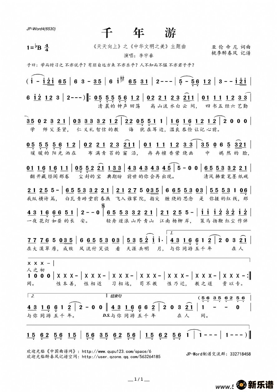 千年游(《天天向上》之《中华文明之美》主题曲)李宇春 李宇春演唱的千年游(《天天向上》之《中华文明之美》主题曲)歌词,千年游(《天天向上》之《中华文明之美》主题曲)最新曲谱. 此最新曲谱由新乐谱会员 桃李醉春风 上传