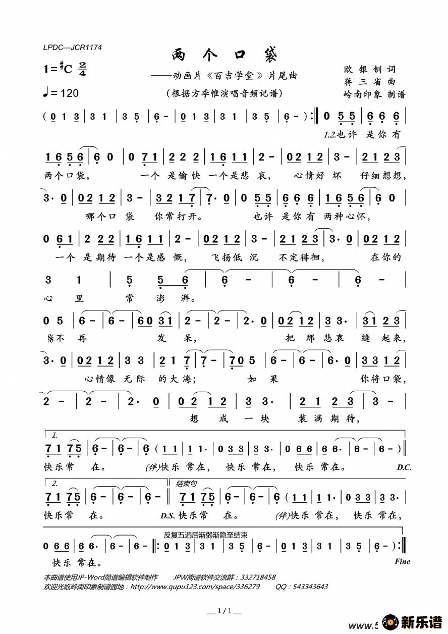 《两个口袋》最新曲谱 方季惟-岭南印象制谱