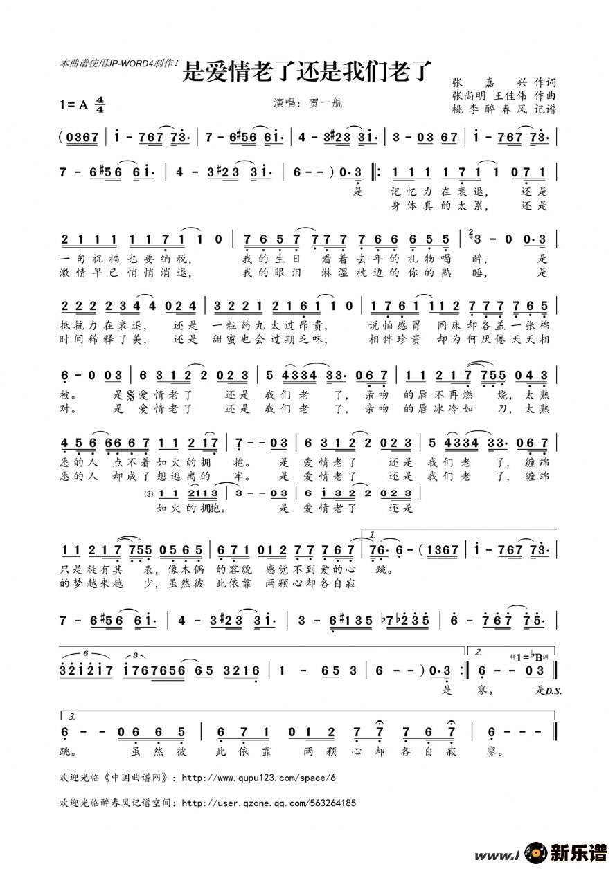 是爱情老了还是我们老了贺一航 贺一航演唱的是爱情老了还是我们老了歌词,是爱情老了还是我们老了最新曲谱. 是记忆力在衰退还是一句祝福也要纳税我的生日 看着去年的礼物喝醉是抵抗力在衰退还是一粒药丸太过昂贵说怕感冒 同床却各盖一张棉被是爱情老了 还是我们老了亲吻的唇不再燃烧太熟悉的人 点不着如火的拥抱是爱情老了还是我们老了缠绵只是徒有其表像木偶的容貌 感觉不到爱的心跳是身体真的太累还是激情早已悄悄消退我的眼泪 淋湿枕边的你的熟睡是时间稀释了美还是甜蜜也会过期乏味相伴珍贵 却为何厌倦天天相对是爱情老了 还是我们老了 亲吻的唇冰冷如刀太熟悉的人 却成了想逃离的牢是爱情老了 还是我们老了缠绵的梦越来越少虽然彼此依靠 两颗心却各自寂寥是爱情老了还是我们老了亲吻的唇不再燃烧太熟悉的人 点不着如火的拥抱是爱情老了 还是我们老了缠绵只是徒有其表像木偶的容貌感觉不到爱的心跳虽然彼此依靠 两颗心却各自寂寥 此最新曲谱由新乐谱会员 桃李醉春风 上传