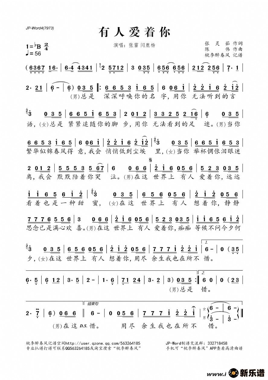 有人爱着你张雷/闫鹿杨 张雷/闫鹿杨演唱的有人爱着你歌词,有人爱着你最新曲谱. 总是深深呼唤你的名字用你无法听到的言语总是紧紧追随你的脚步用你无法看到的足迹当你繁华似锦春风得意我会悄悄低到尘埃里当你举杯惆怅泪眼迷离我会默默陪着你哭泣在这世界上有人爱着你远远看着也是一种甜蜜在这世界上有人想着你静静思念已是满心欢喜在这世界上有人爱着你痴痴等候不问今夕何夕在这世界上有人想着你用尽余生我也在所不惜总是深深呼唤你的名字用你无法听到的言语总是紧紧追随你的脚步用你无法看到的足迹当你繁华似锦春风得意我会悄悄低到尘埃里当你举杯惆怅泪眼迷离我会默默陪着你哭泣在这世界上有人爱着你远远看着也是一种甜蜜在这世界上有人想着你静静思念已是满心欢喜在这世界上有人爱着你痴痴等候不问今夕何夕在这世界上有人想着你用尽余生我也在所不惜在这世界上有人爱着你远远看着也是一种甜蜜在这世界上有人想着你静静思念已是满心欢喜在这世界上有人爱着你痴痴等候不问今夕何夕在这世界上有人想着你用尽余生我也在所不惜用尽余生我也在所不惜 此最新曲谱由新乐谱会员 桃李醉春风 上传