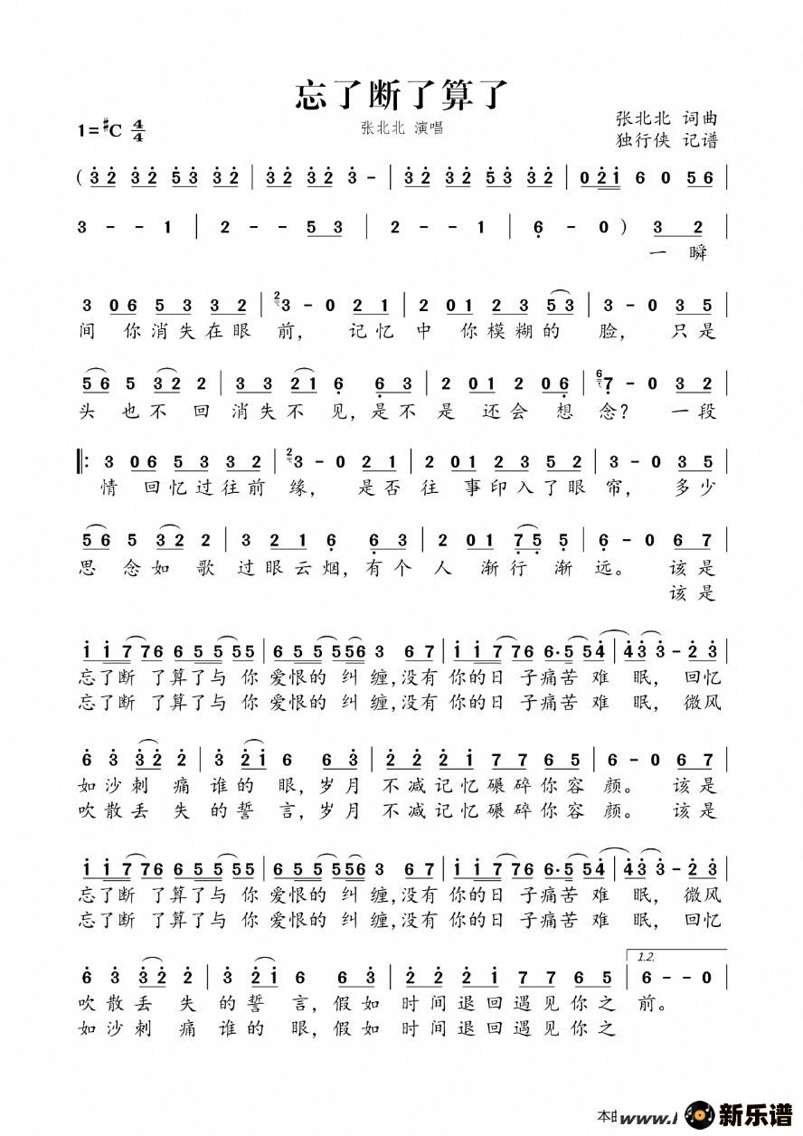 忘了断了算了张北北 张北北演唱的忘了断了算了歌词,忘了断了算了最新曲谱. 一瞬间 你消失在眼前记忆中你模糊的脸只是头也不回 消失不见是不是还会想念一段情回忆过往前缘是否往事印入了眼帘多少思念如歌 过眼云烟有个人渐行渐远该是忘了断了算了与你爱恨的纠缠没有你的日子痛苦难眠回忆如沙刺痛谁的眼岁月不减记忆碾碎你容颜该是忘了断了算了与你爱恨的纠缠没有你的日子痛苦难眠微风吹散丢失的誓言假如时间退回遇见你之前一段情回忆过往前缘是否往事印入了眼帘多少思念如歌 过眼云烟有个人渐行渐远该是忘了断了算了与你爱恨的纠缠没有你的日子痛苦难眠微风吹散丢失的誓言岁月不减记忆碾碎你容颜该是忘了断了算了与你爱恨的纠缠没有你的日子痛苦难眠回忆如沙刺痛谁的眼假如时间退回遇见你之前微风吹散丢失的誓言假如时间退回遇见你之前 此最新曲谱由新乐谱会员 独行侠 上传