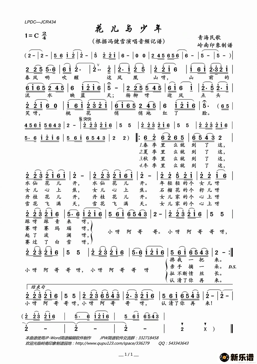 《花儿与少年》最新曲谱 冯健雪-岭南印象制谱