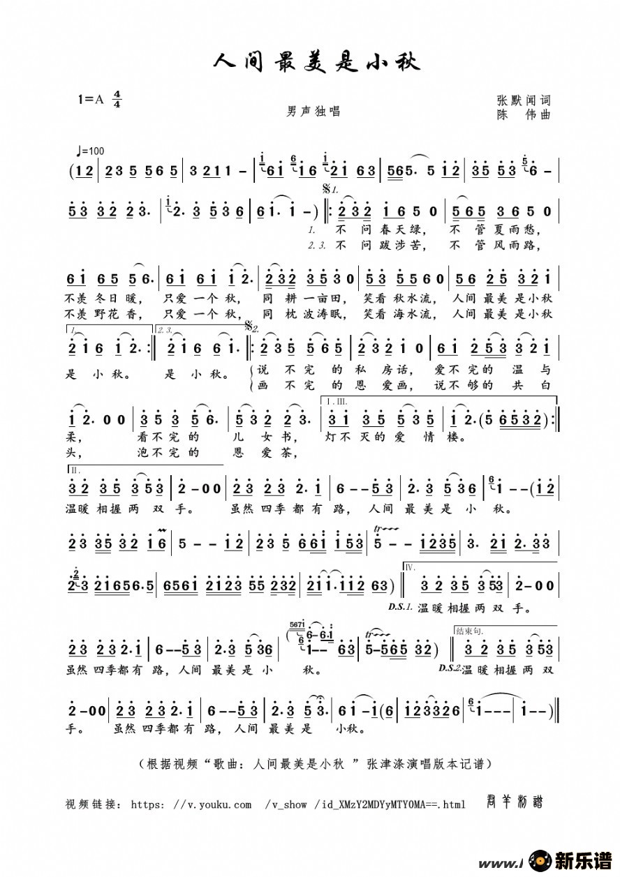 人间最美是小秋张津涤 张津涤演唱的人间最美是小秋歌词,人间最美是小秋最新曲谱. 不问春天绿 不管夏雨愁不羡冬日暖 只爱一个秋同耕一亩田 笑看秋水流人间最美是小秋 是小秋不问跋涉苦 不管风雨路不羡野花香 只爱一个秋同枕波涛眠 笑看海水流人间最美是小秋是小秋说不完的私房话爱不完的温与柔看不完的儿女书灯不灭的爱情楼画不完的恩爱画说不够的共白头泡不完的恩爱茶温暖相握两双手虽然四季都有路 人间最美是小秋不问跋涉苦 不管风雨路不羡野花香 只爱一个秋同枕波涛眠 笑看海水流人间最美是小秋是小秋说不完的私房话爱不完的温与柔看不完的儿女书灯不灭的爱情楼画不完的恩爱画说不够的共白头泡不完的恩爱茶温暖相握两双手虽然四季都有路 人间最美是小秋画不完的恩爱画说不够的共白头泡不完的恩爱茶温暖相握两双手虽然四季都有路 人间最美是小秋 此最新曲谱由新乐谱会员 君羊 上传