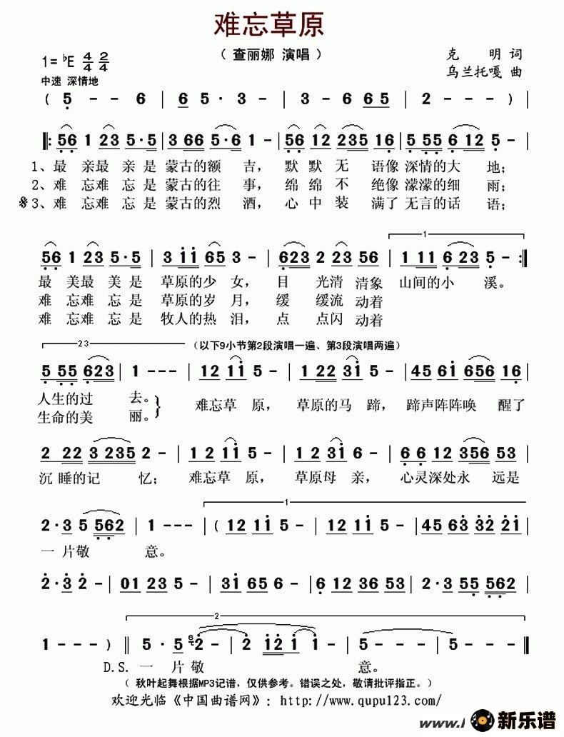 《难忘草原》最新曲谱 查丽娜-秋叶起舞制谱