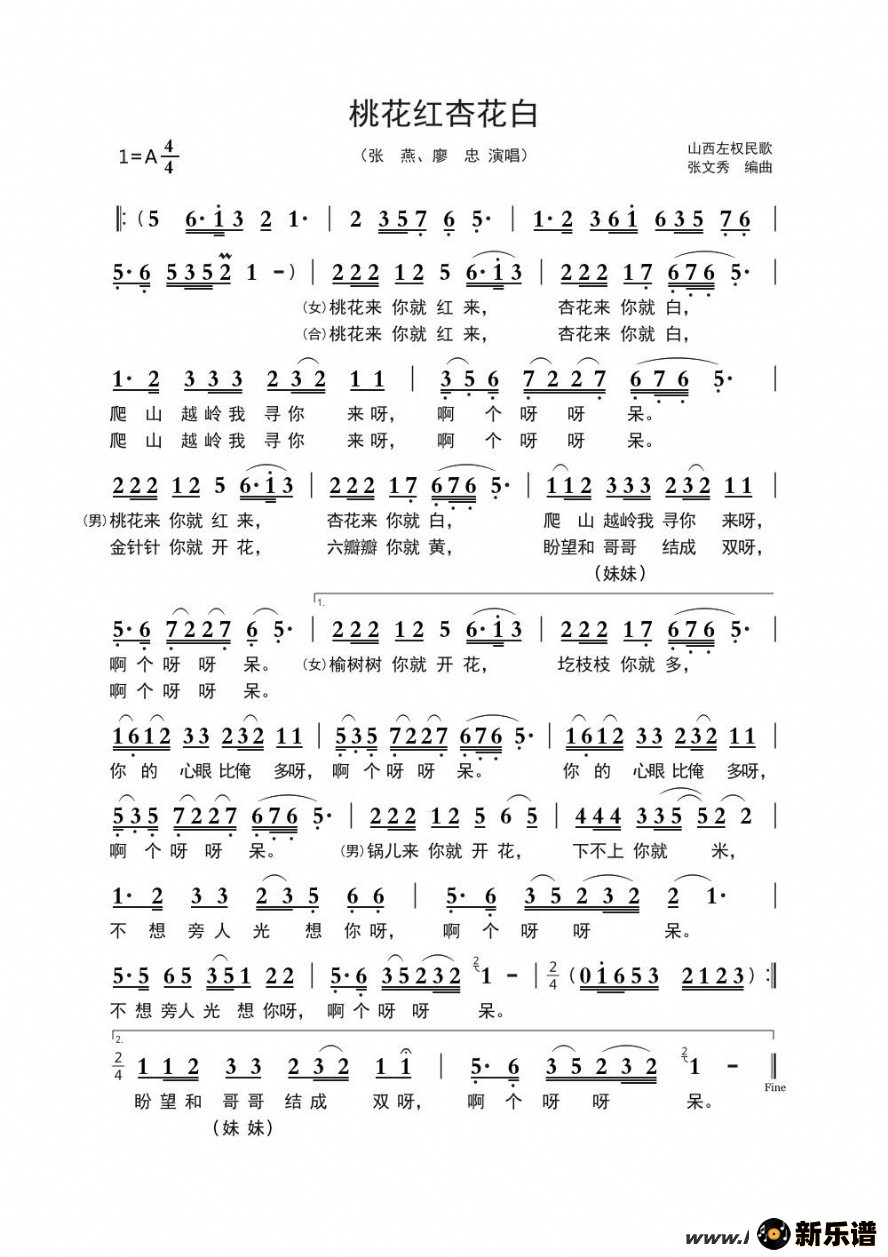 《桃花红杏花白》最新曲谱 张燕、廖忠
