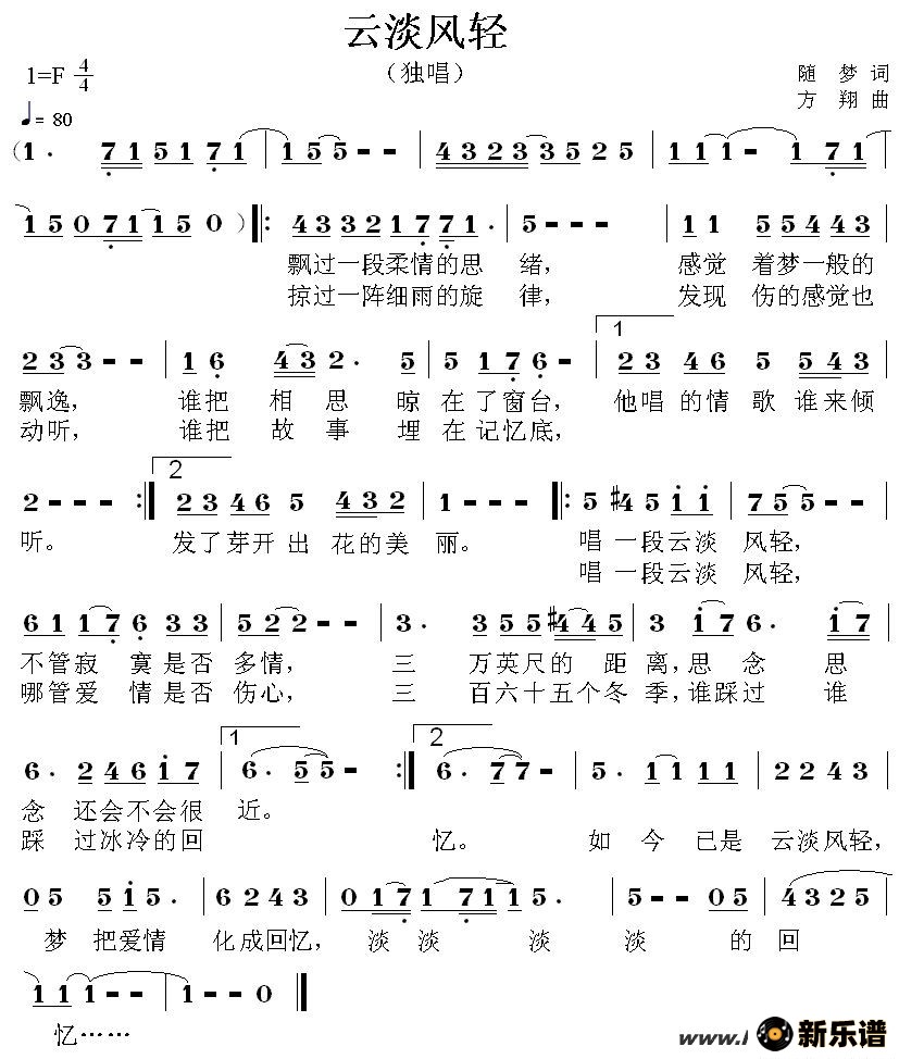 演唱的云淡风轻歌词,云淡风轻最新曲谱.