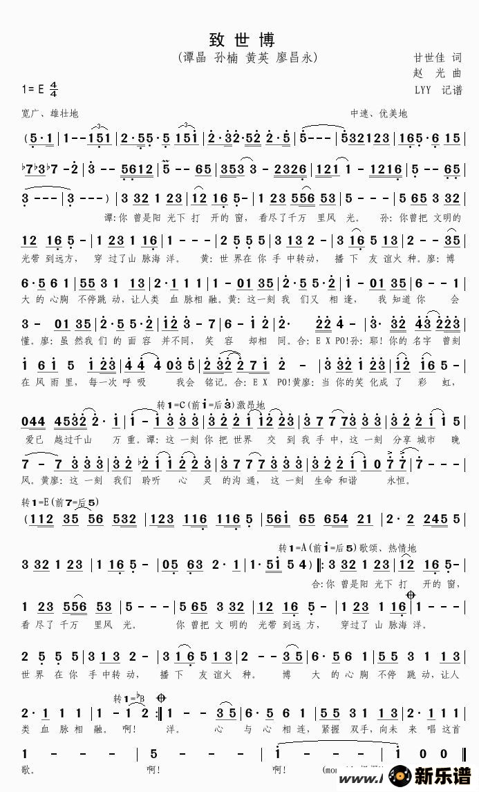 谭晶/孙楠/黄英/廖昌永演唱的致世博歌词,致世博最新曲谱.