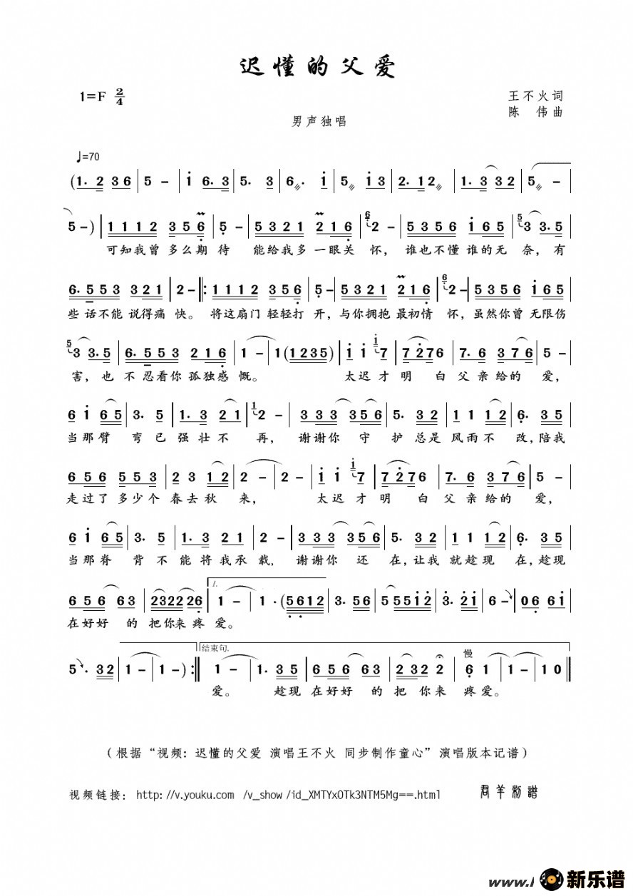 王不火演唱的迟懂的父爱歌词,迟懂的父爱最新曲谱.