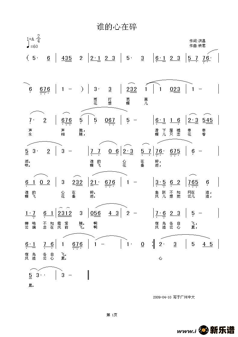 《谁的心在碎》最新曲谱 月夜蝴蝶