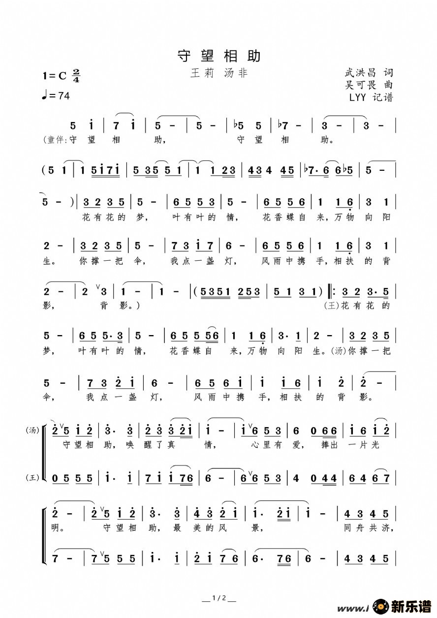王莉 汤非演唱的守望相助歌词,守望相助最新曲谱.