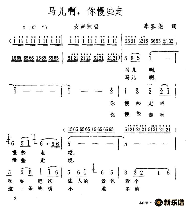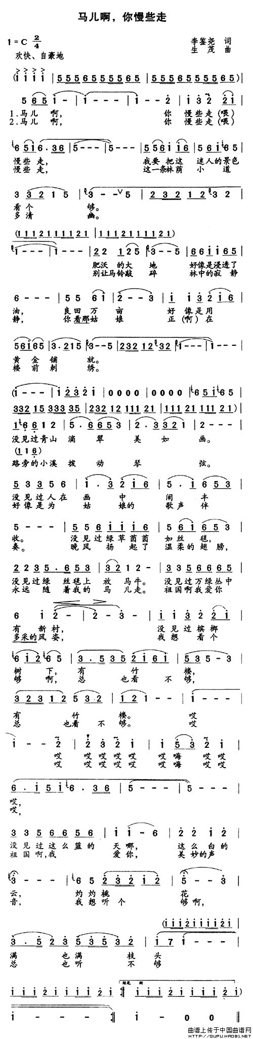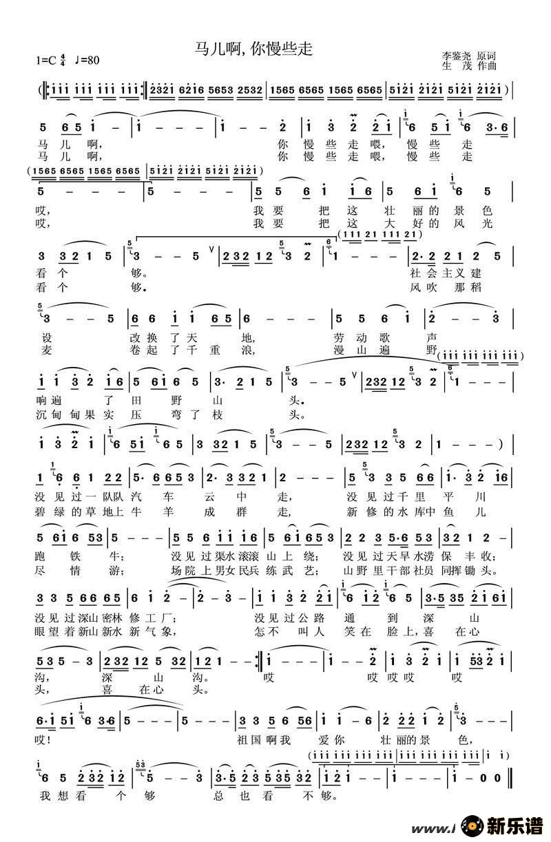 马玉涛演唱的马儿啊,你慢些走歌词,马儿啊,你慢些走最新曲谱.