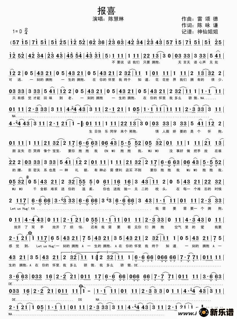 陈慧琳演唱的报喜歌词,报喜最新曲谱.