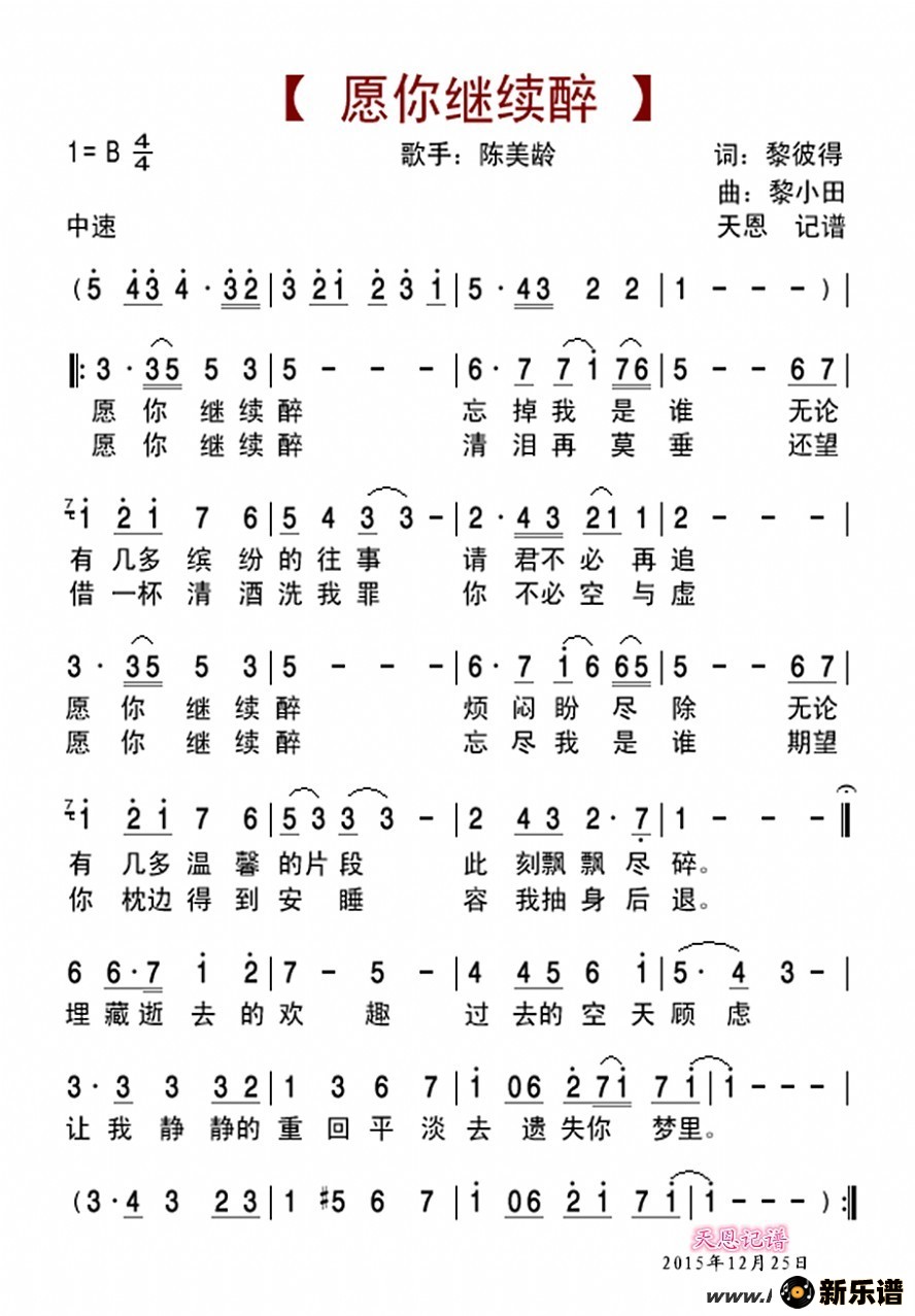 《愿你继续醉》最新曲谱 陈美龄-天恩制谱