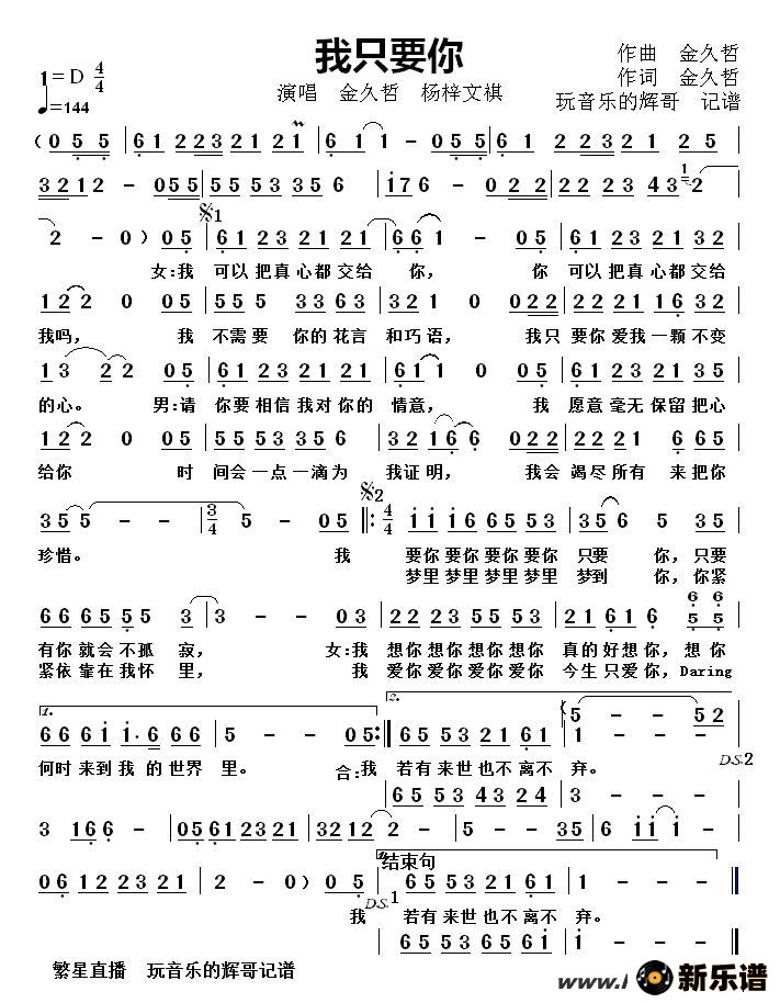 《我只要你》最新曲谱 金久哲/杨梓文祺