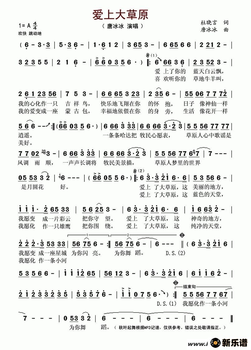 《爱上大草原》最新曲谱 唐冰冰-秋叶起舞制谱