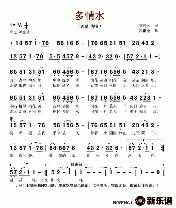 周强演唱的多情水歌词,多情水最新曲谱.