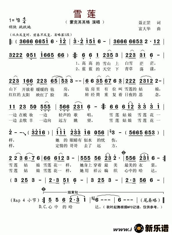 格格(蒙克其其格)演唱的雪莲歌词,雪莲最新曲谱.
