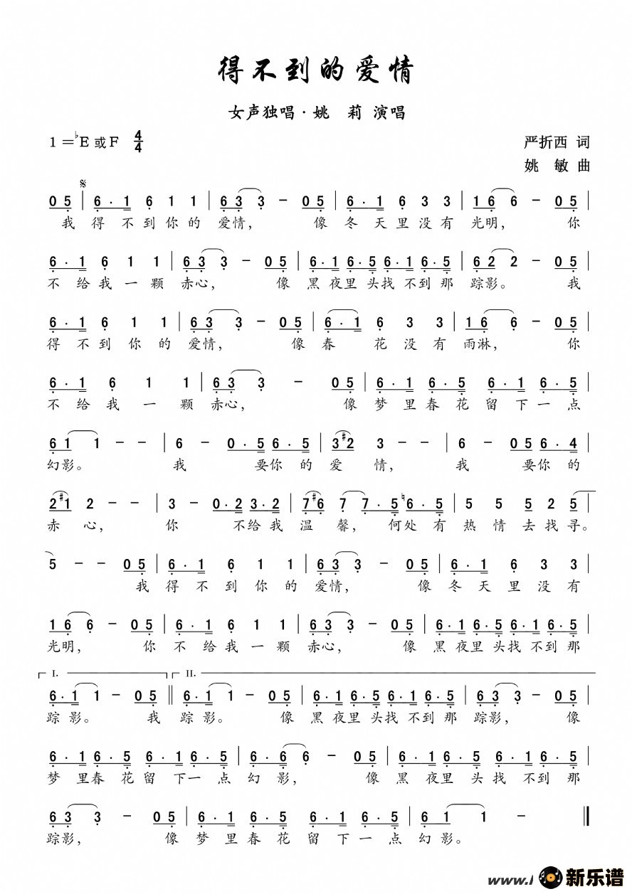 姚莉演唱的得不到的爱情歌词,得不到的爱情最新曲谱.