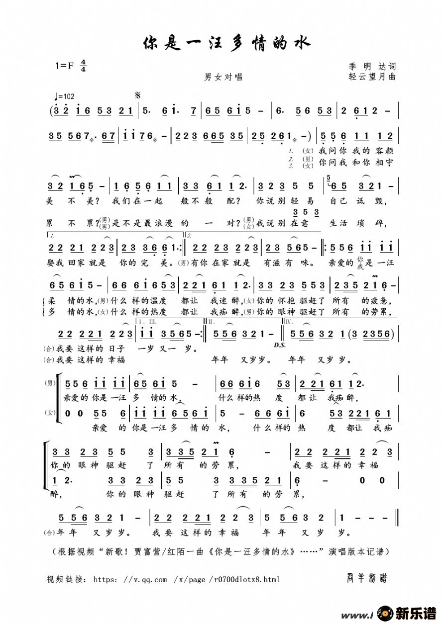 贾富营、红陌演唱的你是一汪多情的水歌词,你是一汪多情的水最新曲谱.