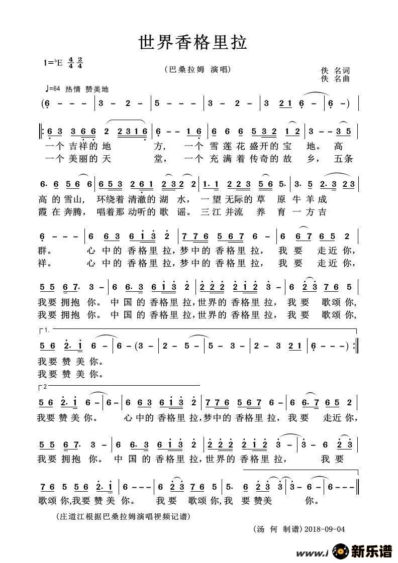 《世界香格里拉》最新曲谱 巴桑拉姆