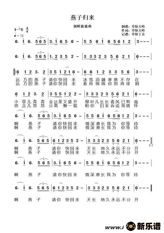 草原丁喜演唱的燕子归来歌词,燕子归来最新曲谱.