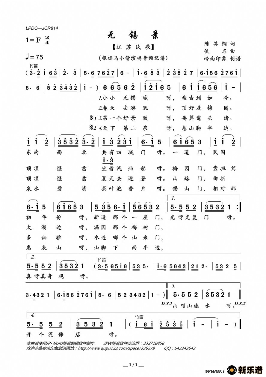 《无锡景》最新曲谱 马小倩-岭南印象制谱