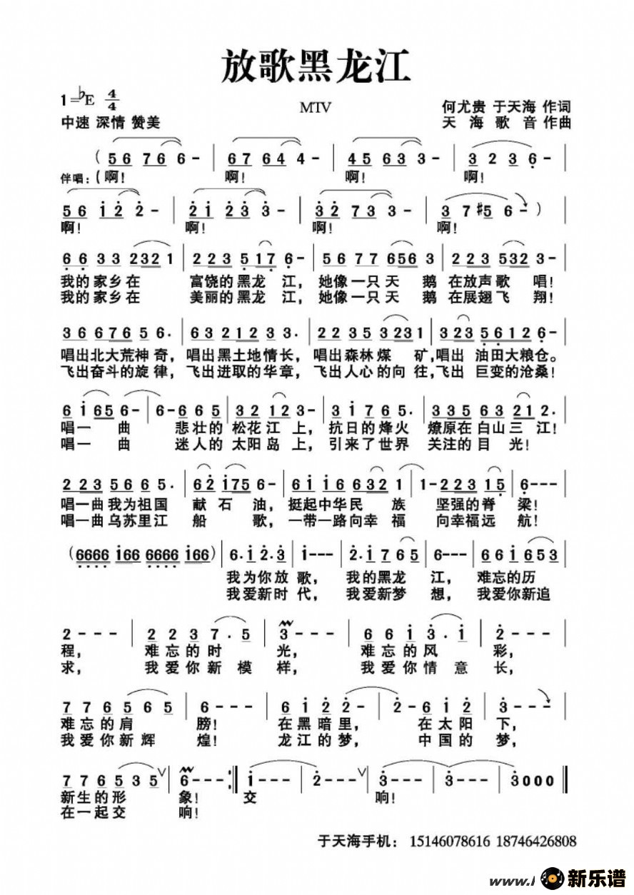 李庆芳演唱的放歌黑龙江歌词,放歌黑龙江最新曲谱.