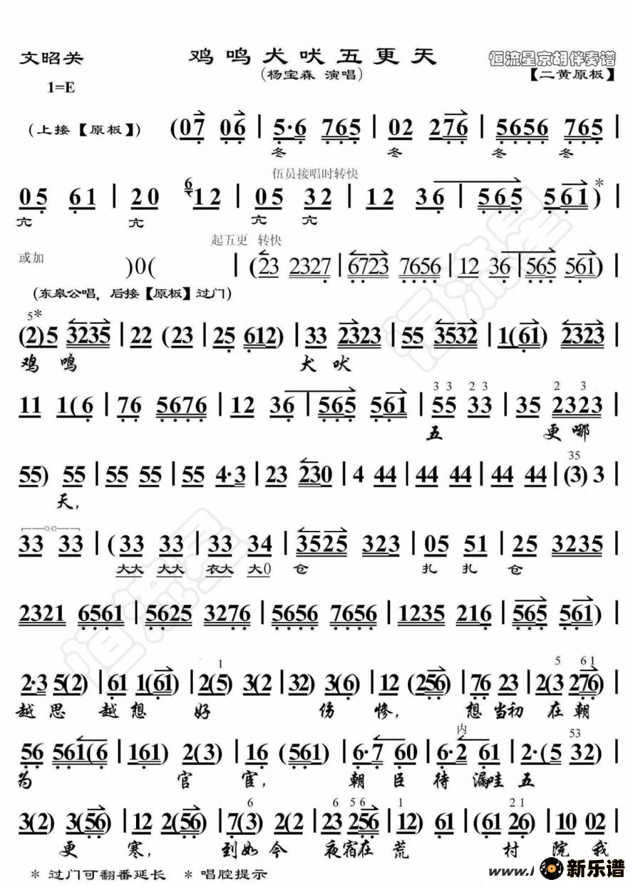 杨宝森演唱的文昭关·鸡鸣犬吠五更天歌词,文昭关·鸡鸣犬吠五更天最新曲谱.