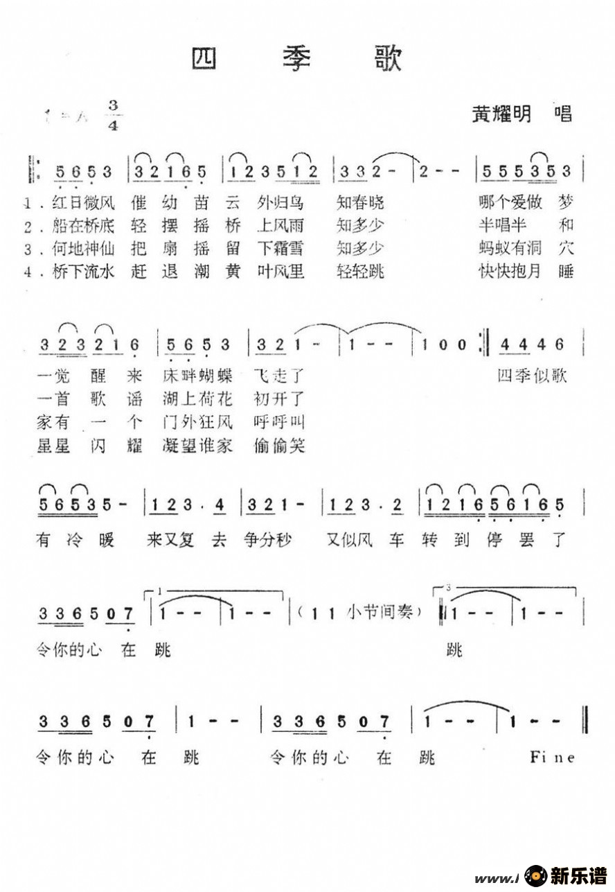 黄耀明演唱的四季歌歌词,四季歌最新曲谱.