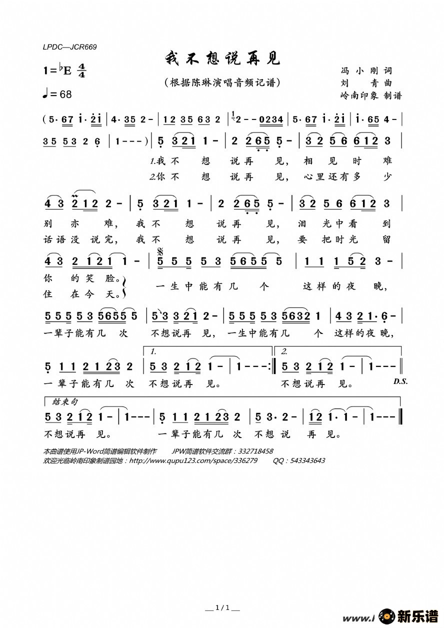 《我不想说再见》最新曲谱 陈琳-岭南印象制谱