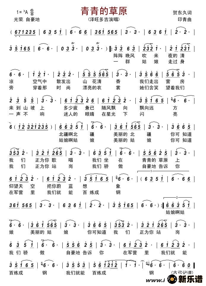 《青青的草原》最新曲谱 泽旺多吉-古弓制谱