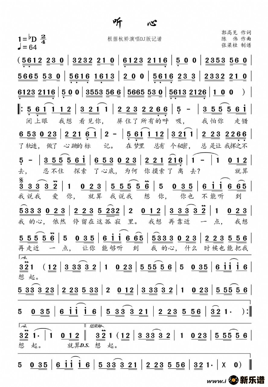 《听心(dj版)(最新修正版)》最新曲谱 杭娇